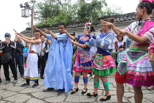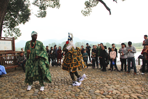 非洲留学生的舞蹈吸引了众多当地村民的围观