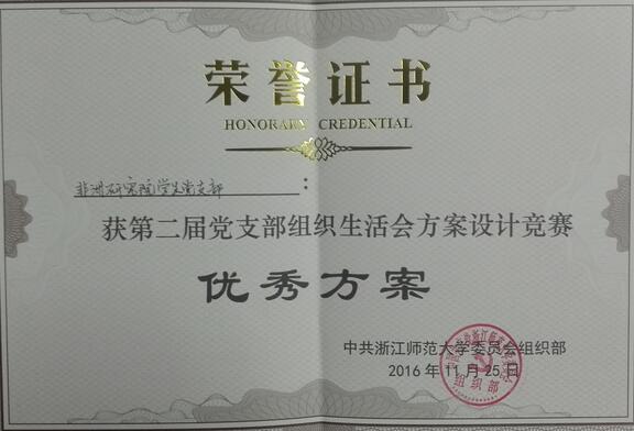 非洲研究院党总支一直致力于将党建工作与非洲研究特色相结合,在探索“党建+科学研究”、“党建+队伍建设”、“党建+平台建设”、“党建+制度建设”、“党建+人才培养”、“党建+社会服务”等方面开展了大量工作,取得了一定成绩,2016年度获评校先进基层党组织。