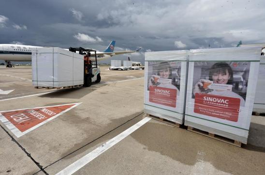 Photo taken on Sept. 24, 2021 shows packages of Sinovac COVID-19 vaccine at the Phnom Penh International Airport in Phnom Penh, Cambodia. (Photo by Phearum/Xinhua)