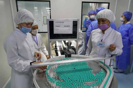 Staff members work on a production line of COVID-19 vaccine at Uzbek pharma Jurabek Laboratories in Uzbekistan, Sept. 5, 2021. Jurabek Laboratories has agreed with China's Anhui Zhifei Longcom Biopharmaceutical on the local production of the ZF-UZ-VAC2001 vaccine. (Photo by Zafar Khalilov/Xinhua)