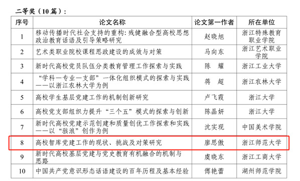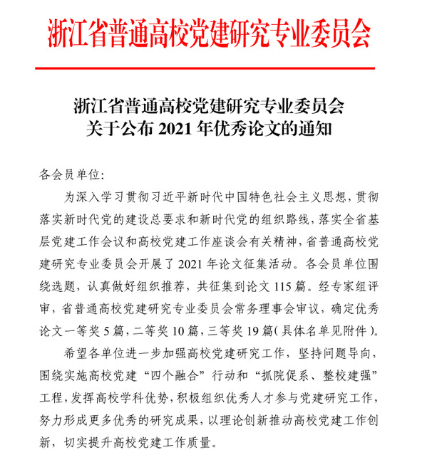 【党建成果】我院教师获浙江省高校党建研究征文2021年优秀论文二等奖