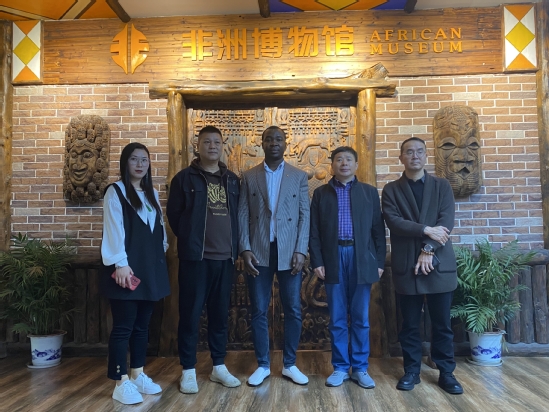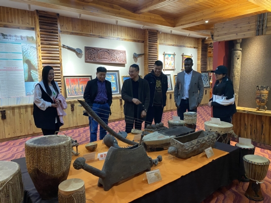2023年4月25日非洲改革与发展中心高级顾问、跨境易货专委会主任黄美华一行来参观我校非洲博物馆,孙竹详细介绍馆内藏品。