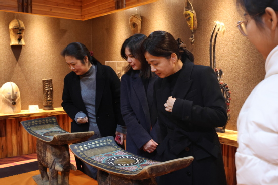 2025年3月6日,浙江音乐学院党委副书记蔡亦军一行参观非洲博物馆、中非交流博物馆,志愿者团成员向其介绍馆内藏品情况。