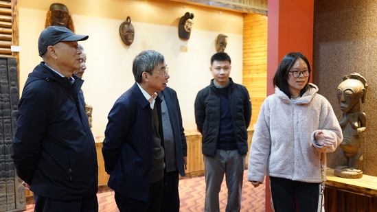 2025年3月31日,浙江大学关心下一代工作委员会常务副主任、校党委原副书记兼副校长张宏健率队来我校调研交流并参观非洲博物馆,校党委副书记、校关工委主任吕迎春陪同调研,非洲研究院副院长杨凯向其介绍馆内藏品情况。