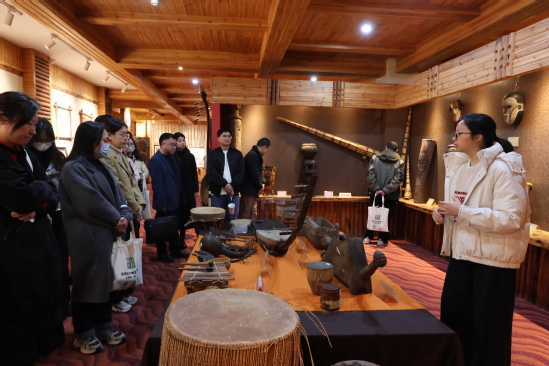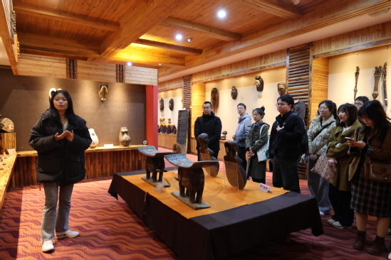 2025年4月1日,宁波国资委通讯骨干70人参观非洲博物馆、中非交流博物馆,志愿者团成员向其介绍馆内藏品情况。
