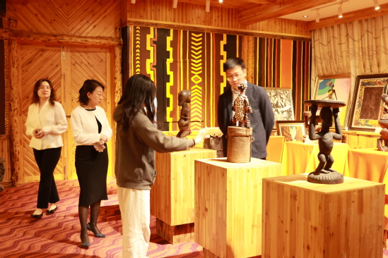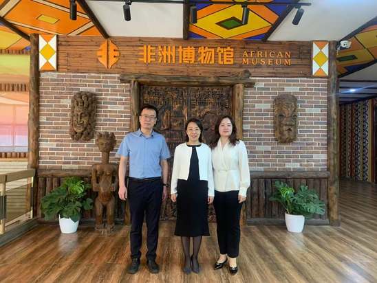 2025年4月11 日,大庆师范学院党委副书记刘迪一行参观非洲博物馆、中非交流博物馆,志愿者团成员向其介绍馆内藏品情况。