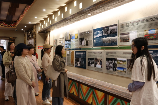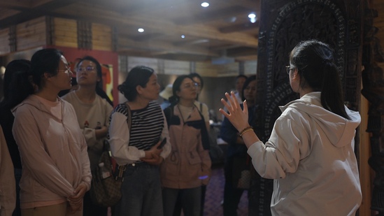 2025年4月14日,浙江绍兴越城区中小学教研人员培训班80人参观非洲博物馆、中非交流博物馆,志愿者团成员向其介绍馆内藏品情况。
