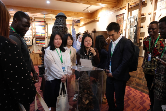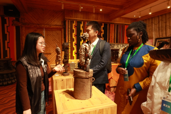 2025年4月17日,由教育部中外语言交流合作中心主办,浙江师范大学承办的2025年新汉学博士学术研习营成员参观非洲博物馆、中非交流博物馆,志愿者团成员向参观团详细介绍馆内藏品。