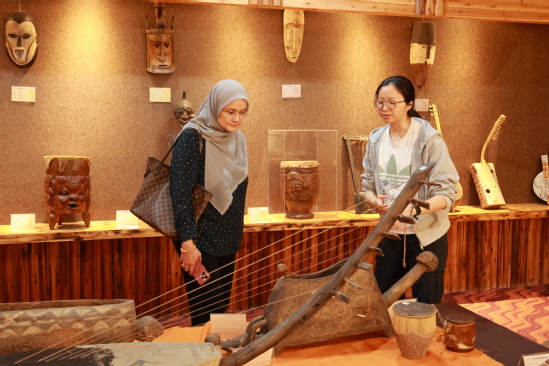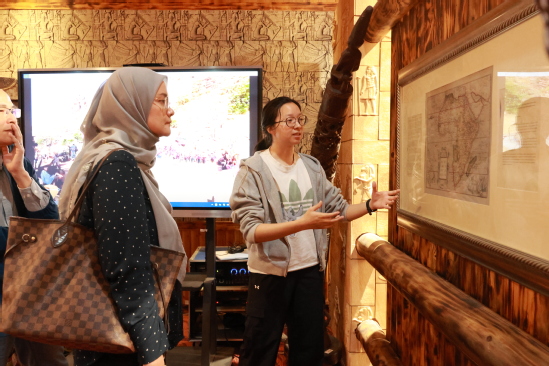 2025年4月29日马来西亚国立大学的职业发展中心主任zaleha教授参观非洲博物馆、中非交流博物馆,志愿者团成员张梓萌向其详细介绍馆内藏品。