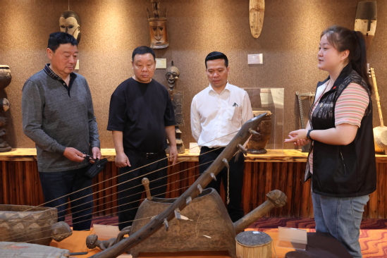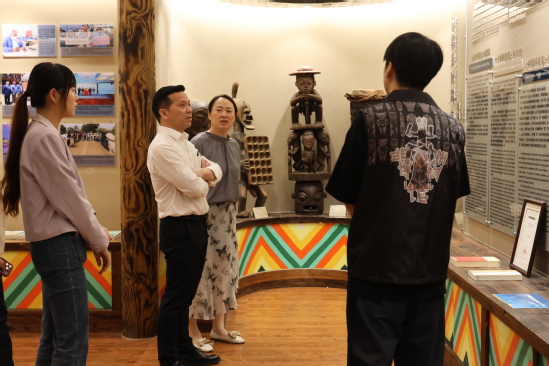 2025年5月28日温州医科大学离退处工作人员来我校交流并参观非洲博物馆、中非交流博物馆,志愿者成员向其详细介绍馆内藏品。