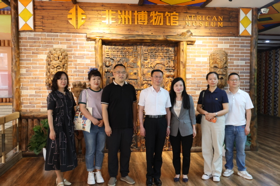 2025年6月4日黔南民族师范学院党委书记熊世桓一行参观非洲博物馆、中非交流博物馆,非洲博物馆志愿者团成员向其详细介绍馆内藏品。