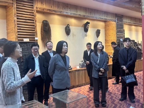 2025年11月7日,平湖市人民政府副市长宋怡玲,平湖市教育局党委书记、局长徐立一行参观非洲博物馆、中非交流博物馆,讲解团成员吴湘媛、李佳慧向参观团介绍馆内藏品。