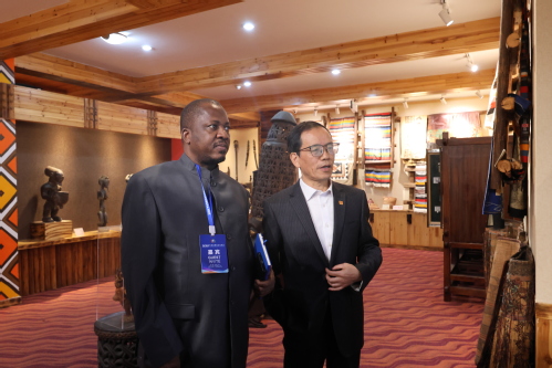 2025年11月8日,尼日利亚卡诺巴耶鲁大学校长哈鲁纳·穆萨教授参观非洲博物馆、中非交流博物馆,非洲研究院院长刘鸿武向其介绍馆内藏品、学院对非研究成果。